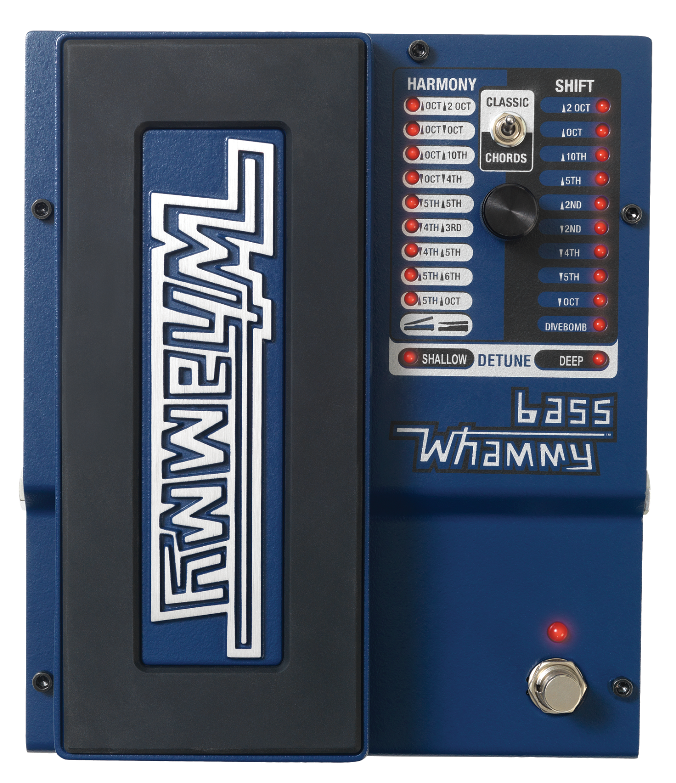 The Bass Whammy is ideal for use with four, five and six string electric basses and employs extremely accurate pitch detection and polyphonic note tracking. The pedal offers two tracking modes, Classic and Chords. Classic mode provides accurate tracking for single note bass lines while Chords mode uses a sophisticated polyphonic algorithm for the smoothest chordal pitch shifting available.